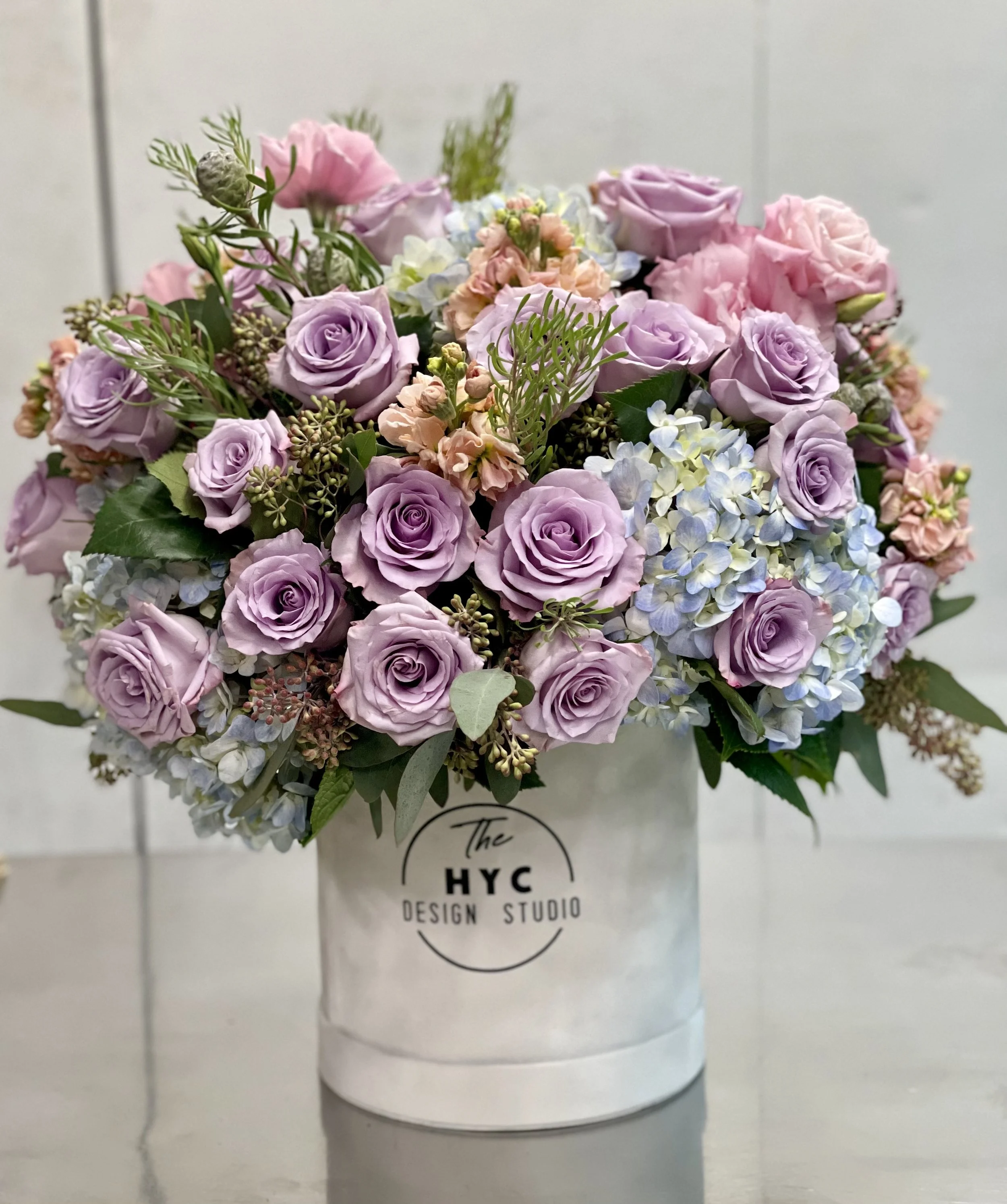 Shop › Image 1 of 1 from $140.00 White Box, Light Blue HYD, Lavender Rose, Pink Lisianthus, Peach Stock, Seeded Eucalyptus,Juniper. Size: Select Size Small Medium Large Quantity: Add To Cart Added! White Box, Light Blue HYD, Lavender Rose, Pink Lisianthus, Peach Stock, Seeded Eucalyptus,Juniper.